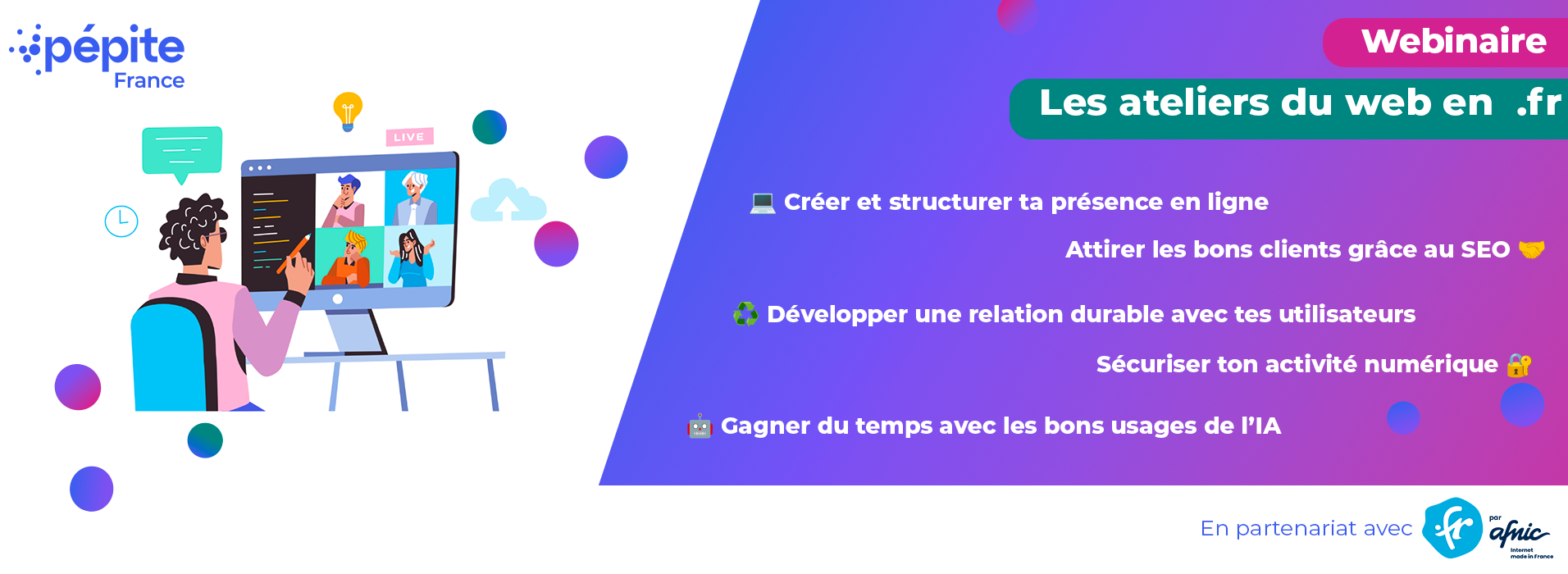 Grâce à ce partenariat, nos étudiants bénéficient du programme « L’Atelier du Web en .fr », un parcours composé de 6 ateliers pratiques pour maîtriser les fondamentaux du numérique et développer efficacement leur présence en ligne. Chaque atelier est conçu pour être pédagogique, concret et interactif, avec des conseils directement applicables aux projets des participants.
